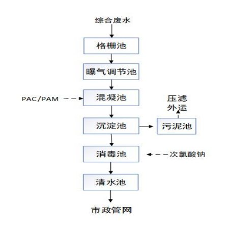医院新建污水处理站规模为1500m3/d,采用“格栅+曝气调节+沉淀+次氯酸钠消毒”处理工艺。污水处理站工艺流程见下图: